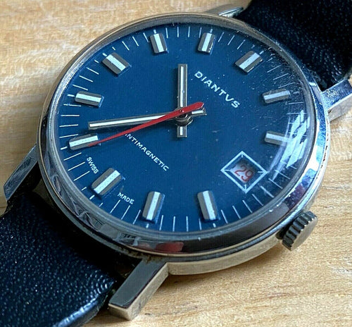 Vintage Diantus Swiss 2292 Men Silver Blue Hand-Wind Mechanical Watch Hours~Date