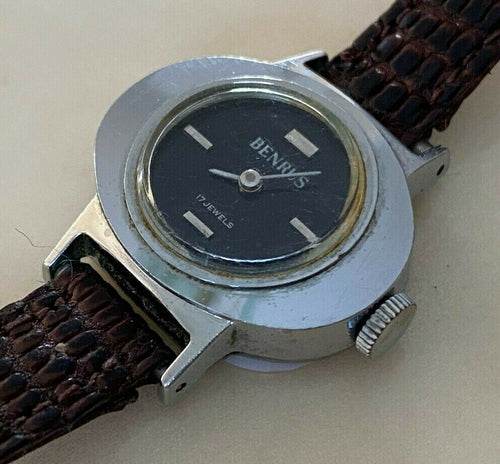 Vintage Benrus Lady 17 Jewels Silver Black Oval Hand-Wind Mechanical Watch Hours