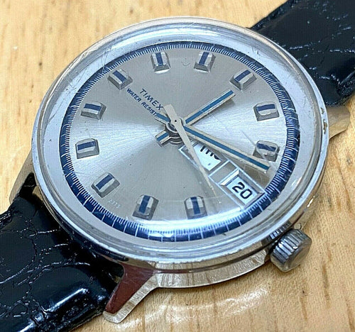 Vintage 1973 Timex Marlin Mens Silver Hand-Wind Mechanical Watch Hours~Day Date