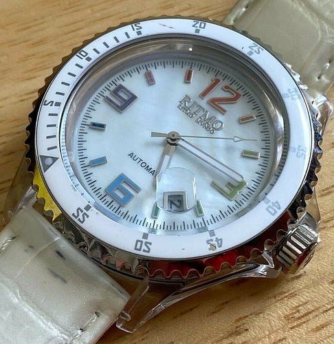 Ritmo Mundo Mens Moving Bezel Clear Case Leather Self-Wind Automatic Watch Hours