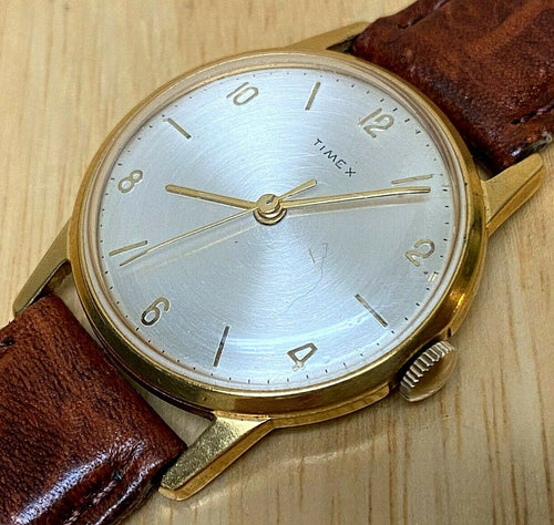 Early Vintage Timex Men Silver Leather Slim Thin Hand-Wind Mechanical Watch Hour