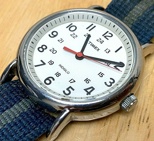 Timex Weekender Indiglo Mens Silver White Analog Quartz Watch Hours~New Battery