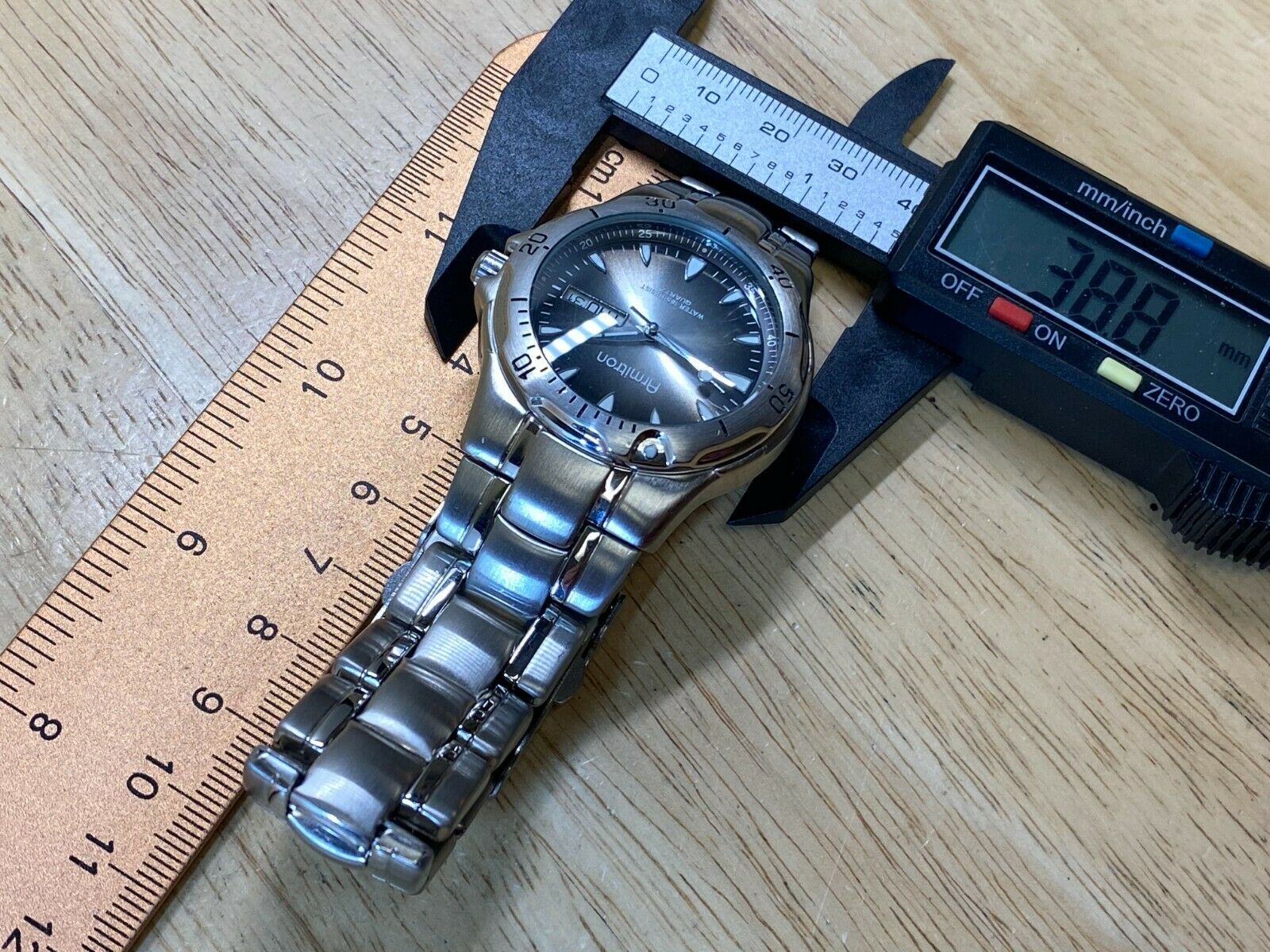 Watch dimension and size: please review the last image for size measurements. Shown on caliper is the approximate watch width in mm without crown or button.