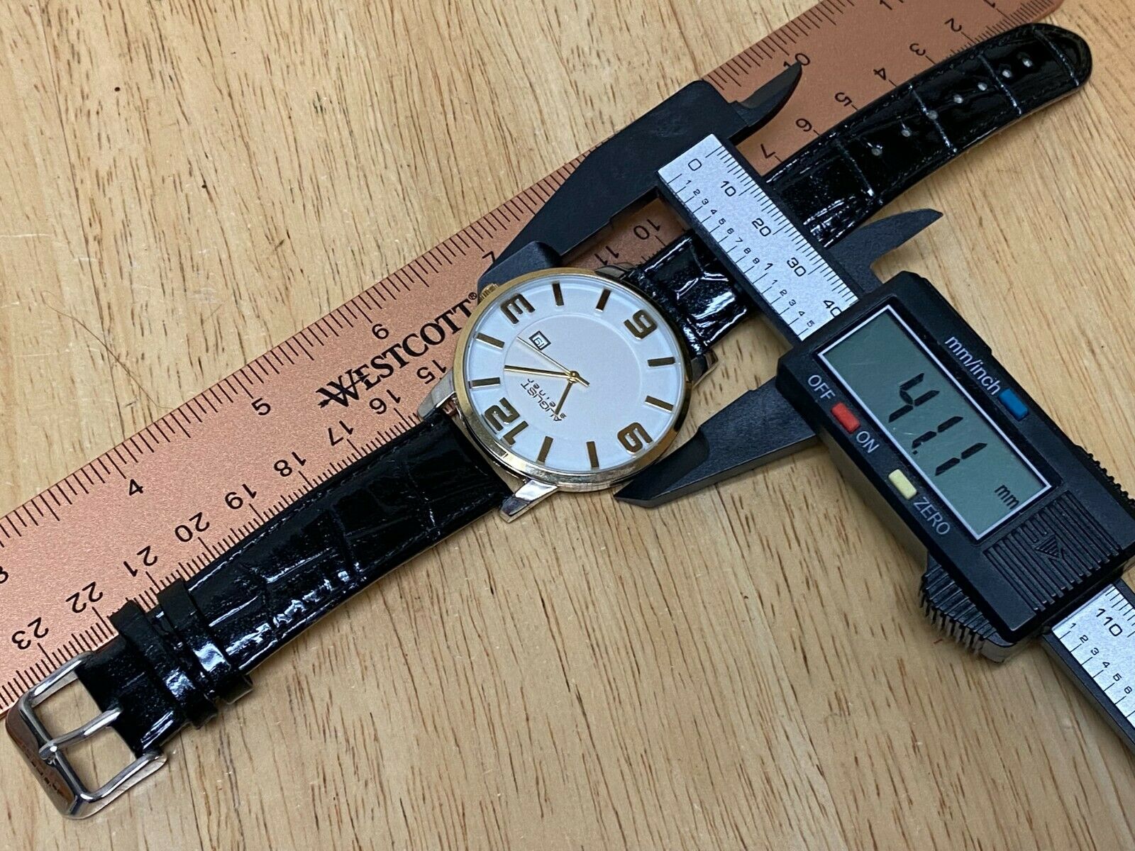 Watch dimension and size: please review the last image for size measurements. Shown on caliper is the approximate watch width in mm without crown or button.
