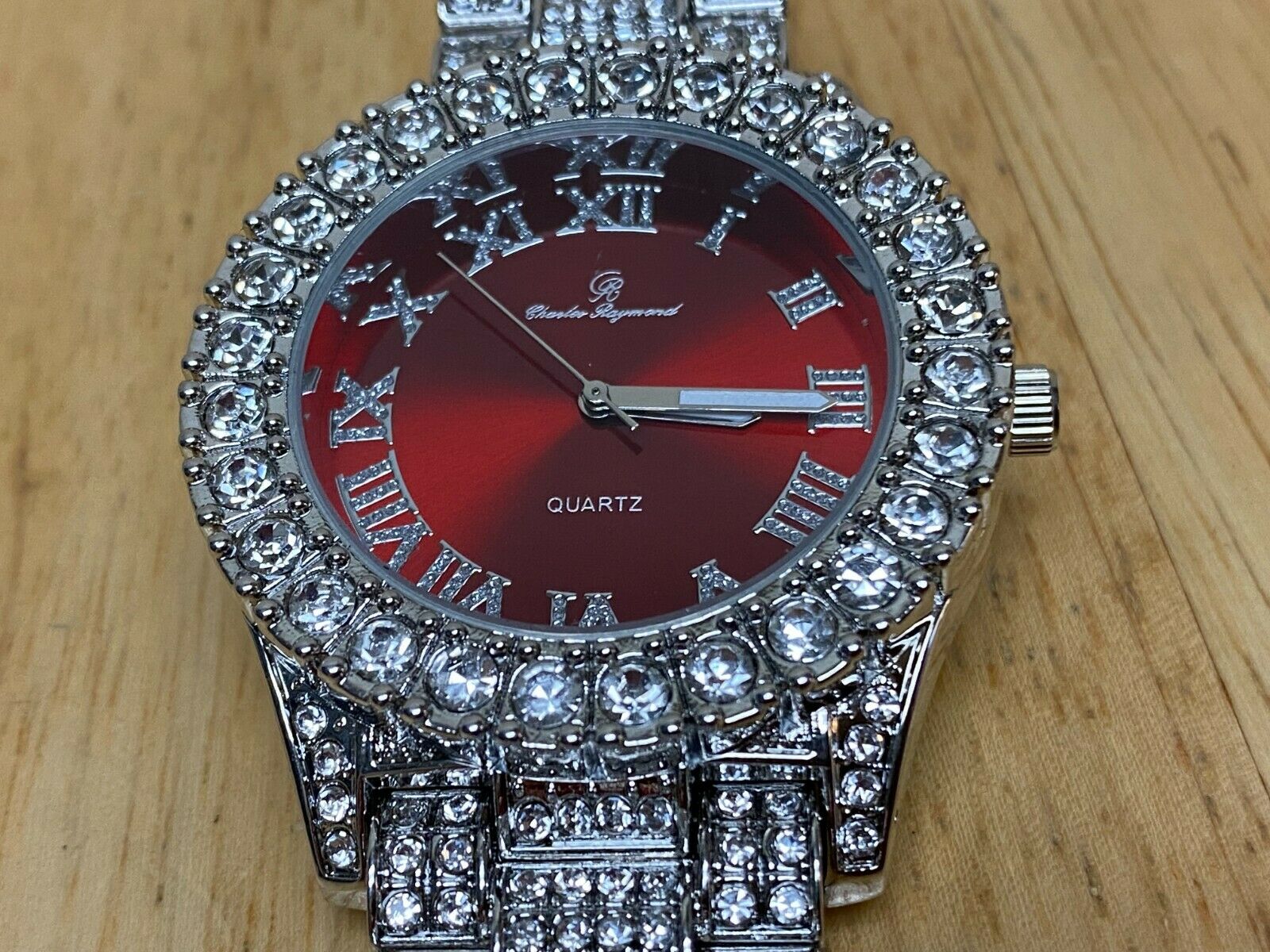 Charles Raymond Men Bling Rhinestone Red Dial Analog Quartz Watch Hours~New Batt