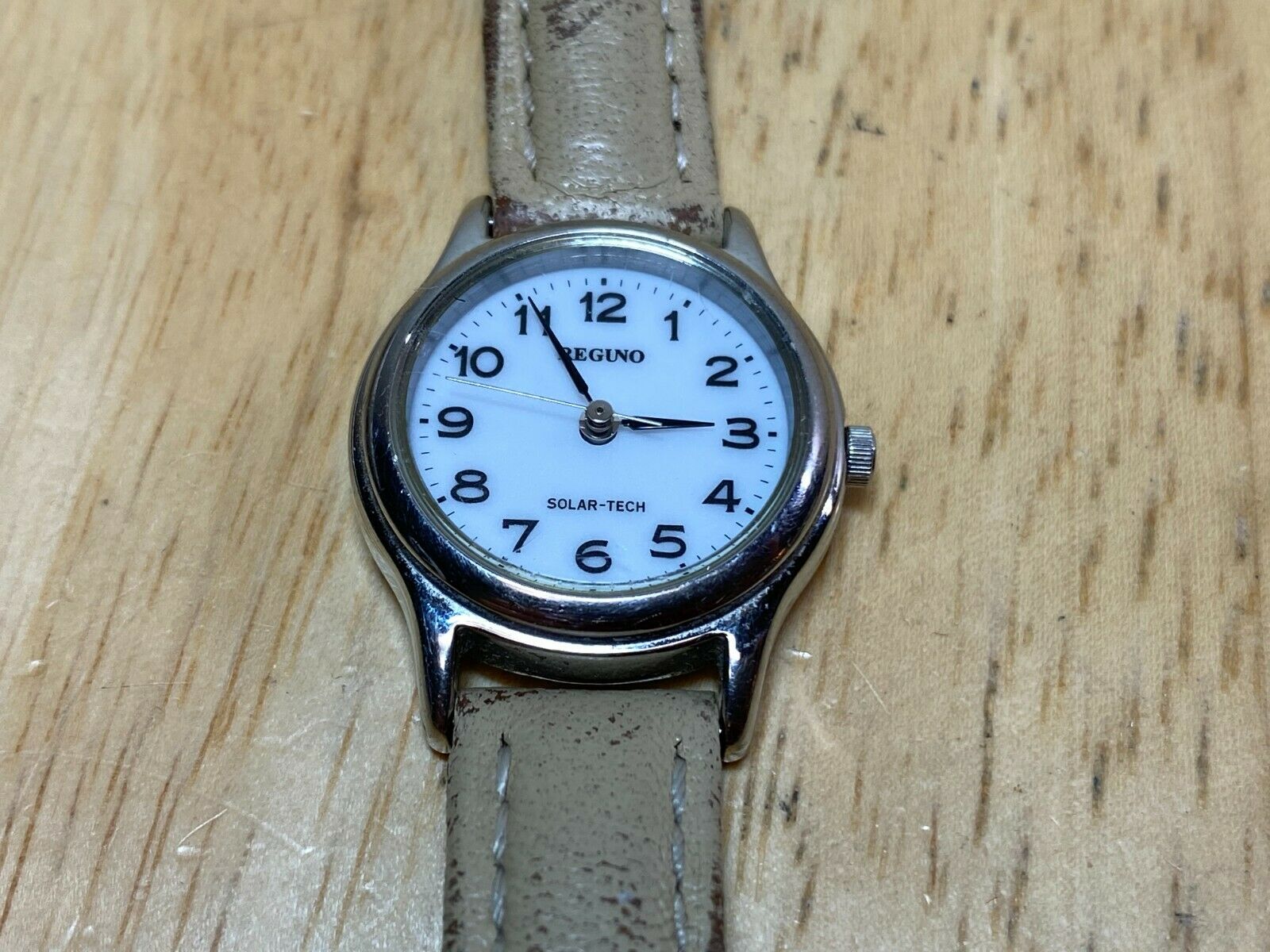 Reguno Solar-Tech Lady Silver White Leather Band Analog Quartz Watch Hours