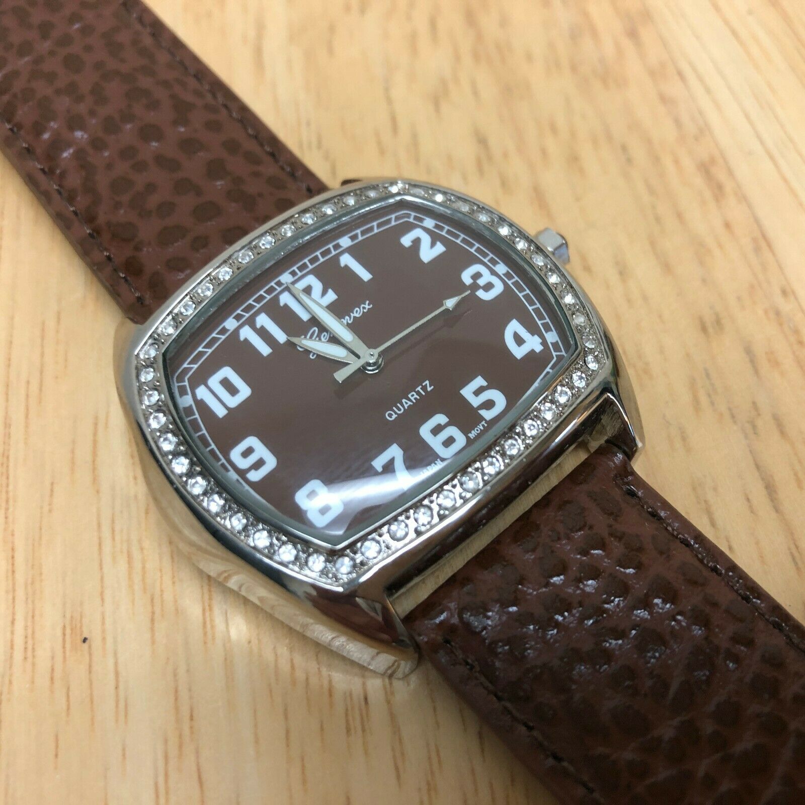 Genevax Men Silver Brown Rhinestone Barrel Analog Quartz Watch Hours~New Battery
