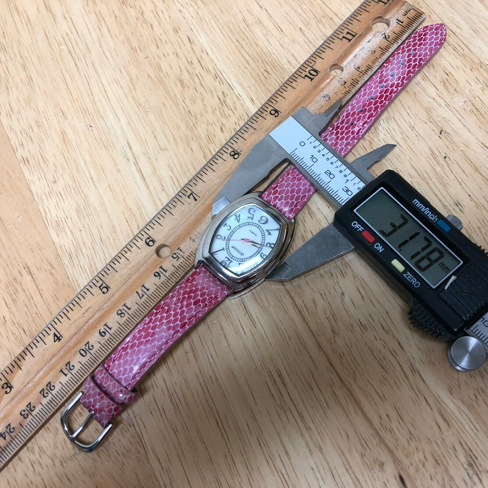 Watch dimension and size: please review the last image for size measurements. Shown on caliper is the approximate watch width in mm without crown or button.