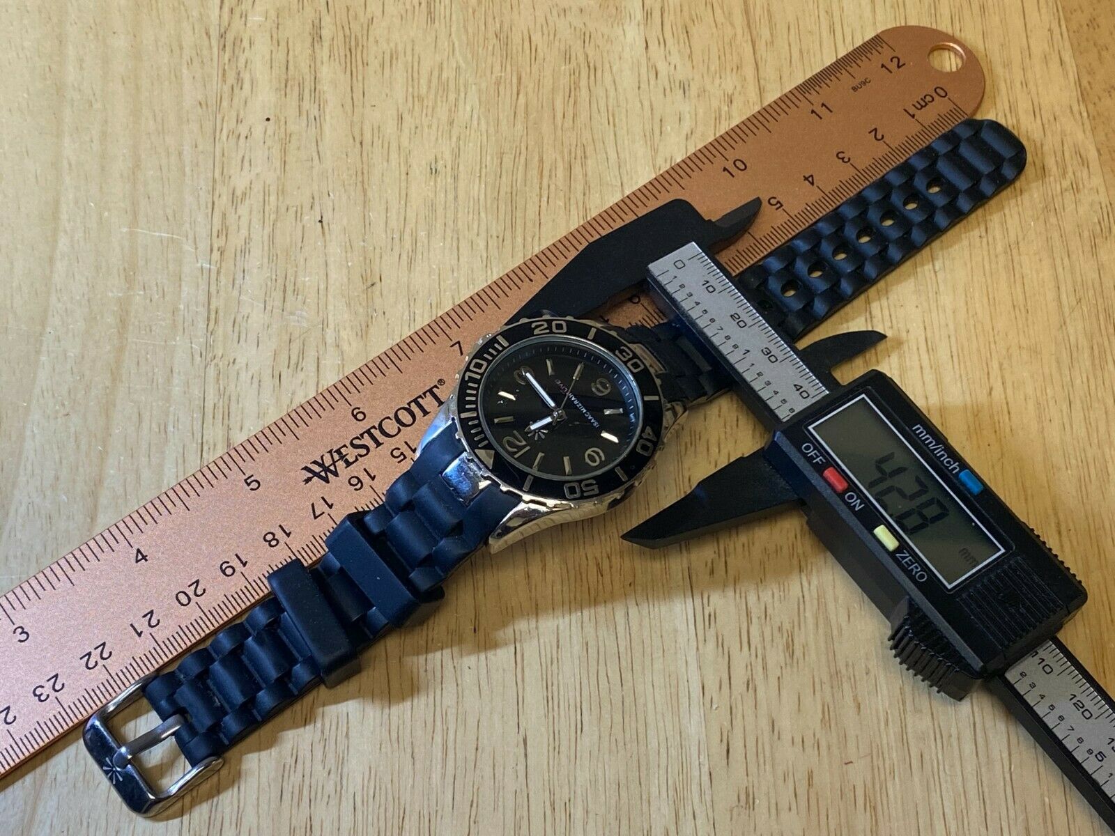 Watch dimension and size: please review the last image for size measurements. Shown on caliper is the approximate watch width in mm without crown or button.