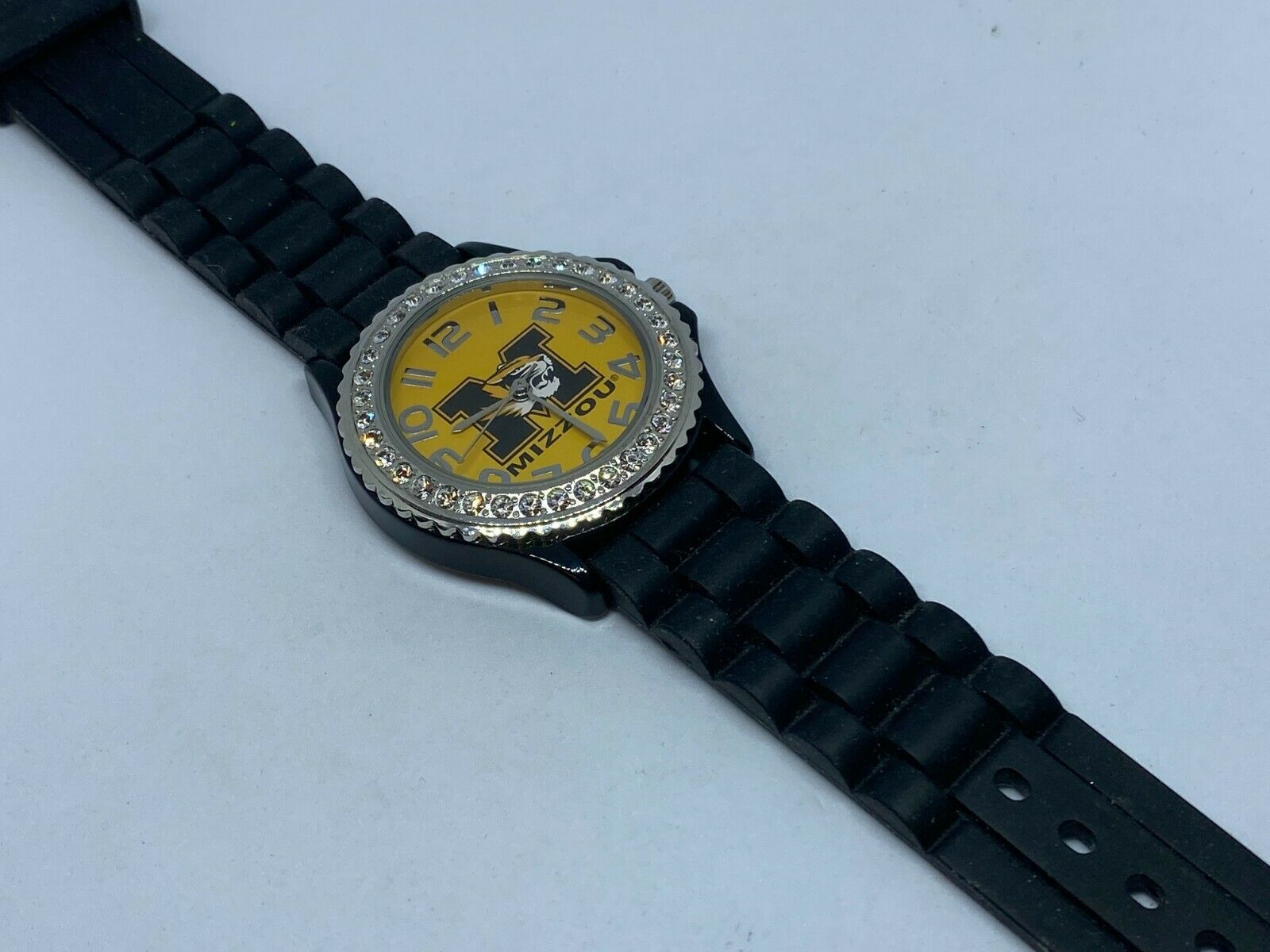Mizzou Mens Black Yellow Rhinestone Japan Movt Analog Quartz Watch Hour~New Batt