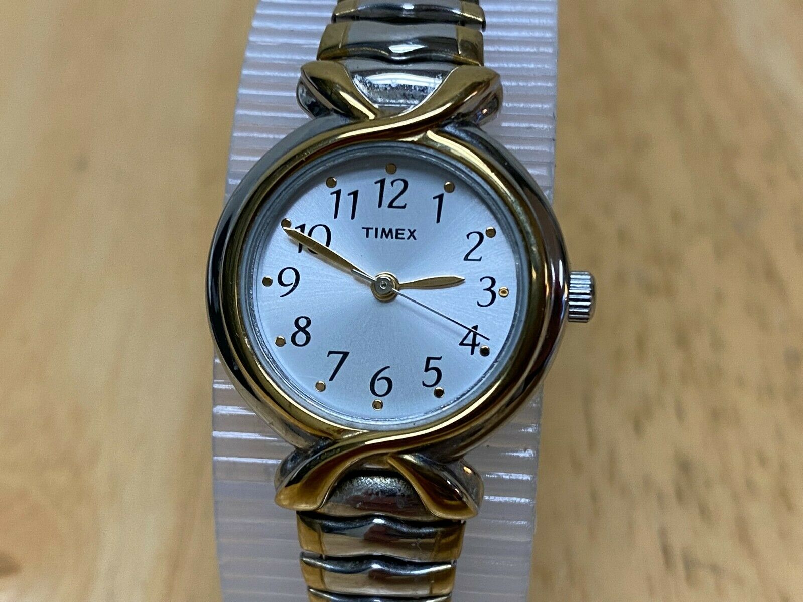 Nice Timex Lady 30m Dual Tone Stretch Band Analog Quartz Watch Hours~New Battery