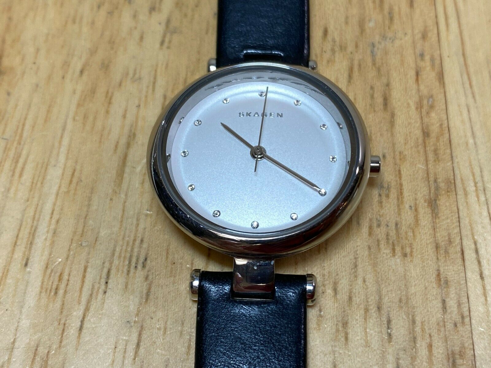 Skagen Lady 30m Rhinestone Steel Leather Analog Quartz Watch Hours~New Battery