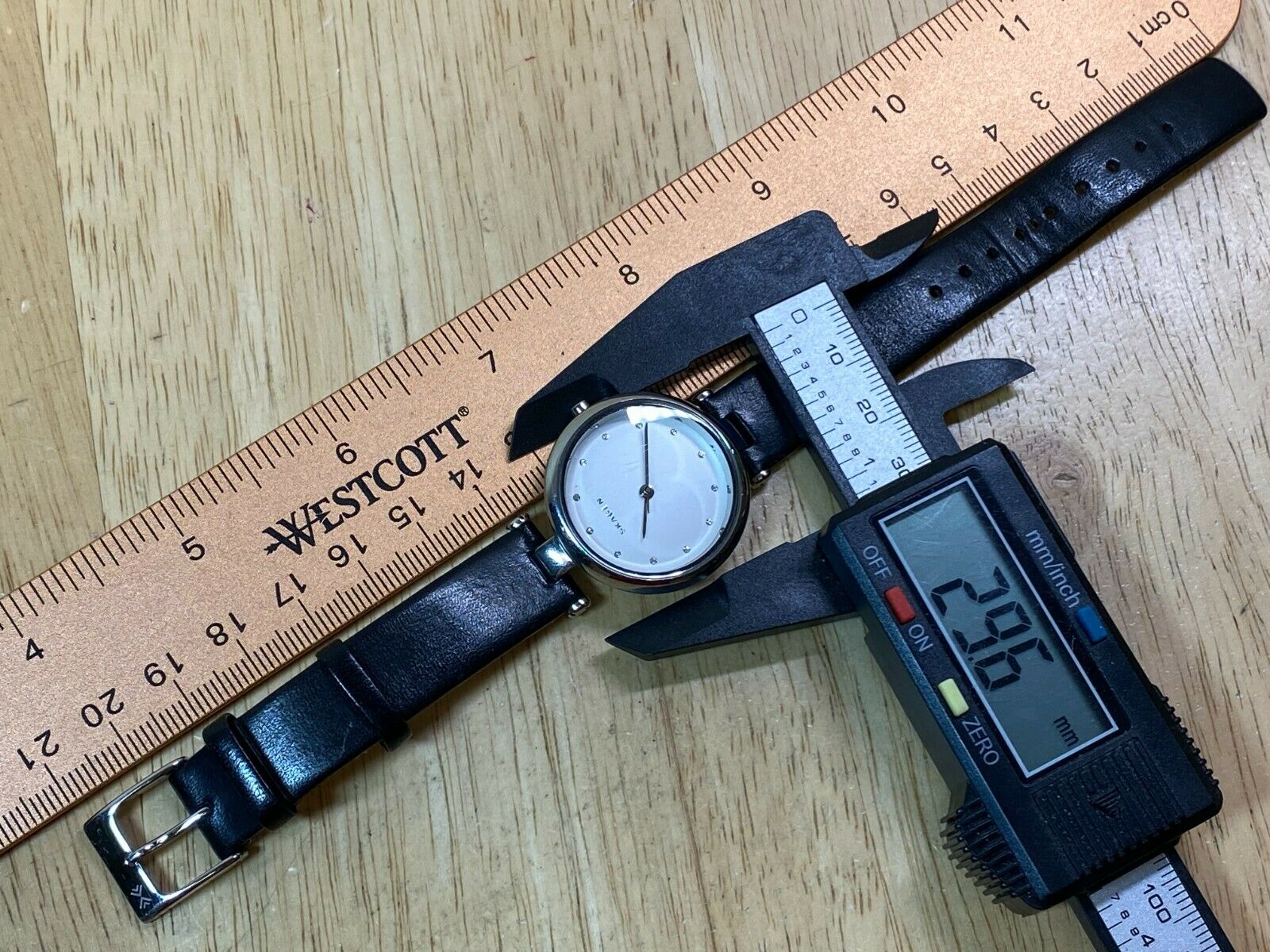 Watch dimension and size: please review the last image for size measurements. Shown on caliper is the approximate watch width in mm without crown or button.