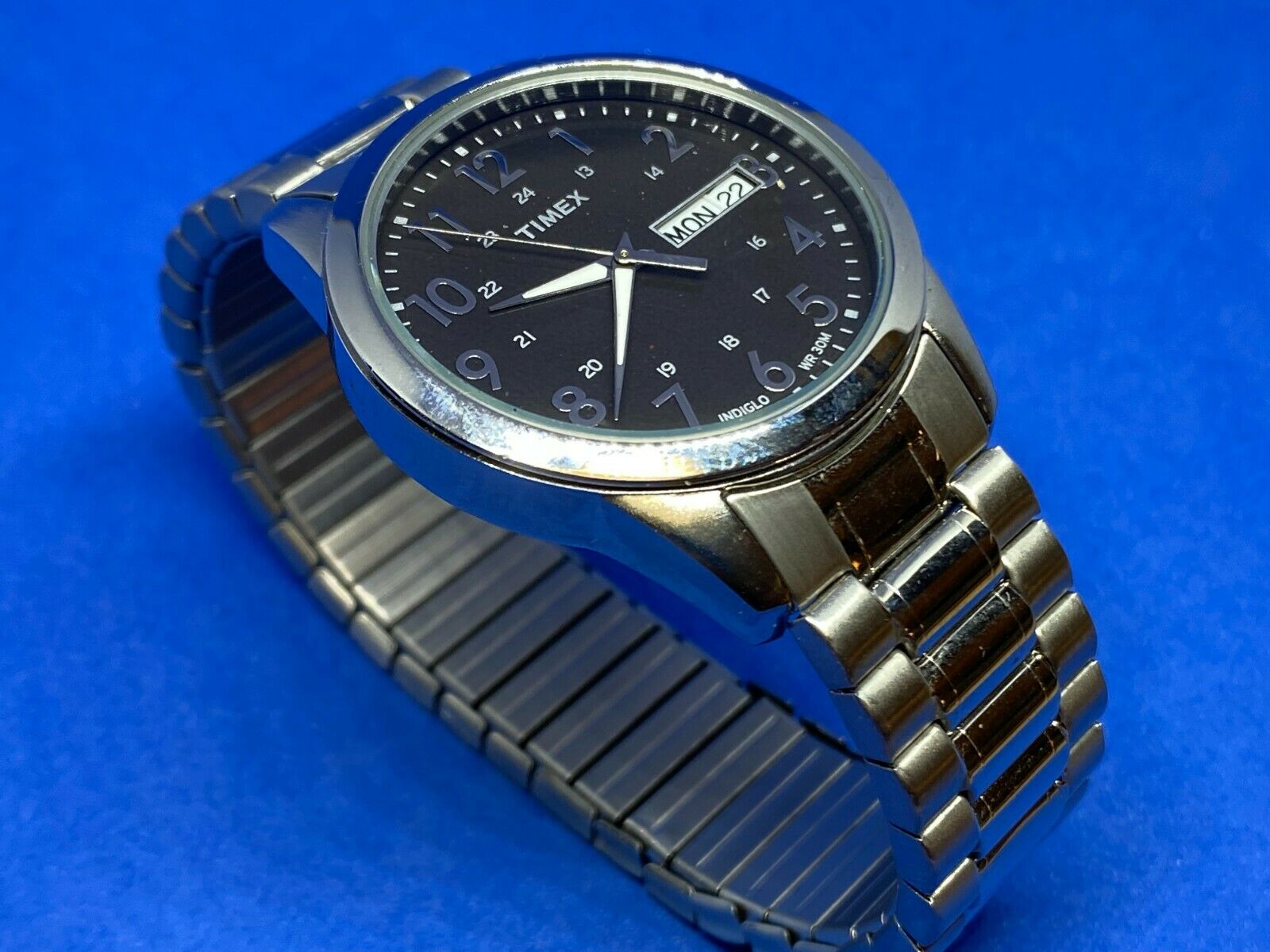 Timex Indiglo Men Silver Black Military Dial Analog Quartz Watch Hours~New Batt