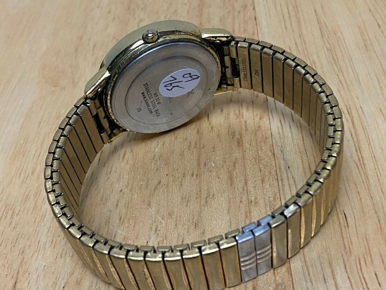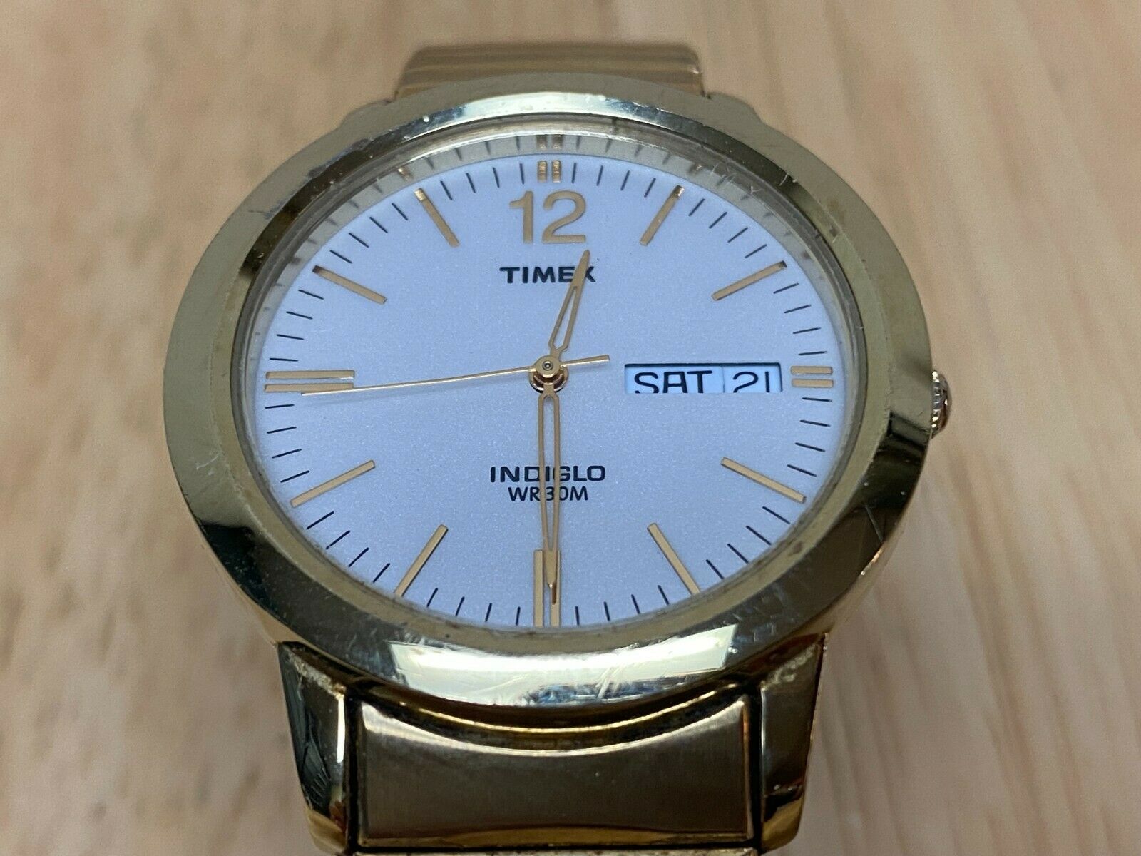 Timex Indiglo Mens 30m Gold Tone Analog Quartz Watch Hours~Day Date~New Battery