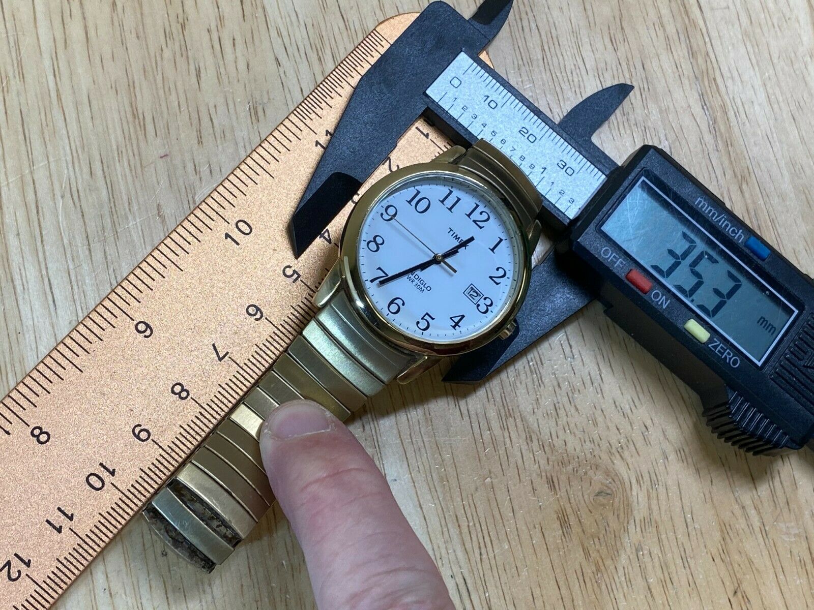 Watch dimension and size: please review the last image for size measurements. Shown on caliper is the approximate watch width in mm without crown or button.