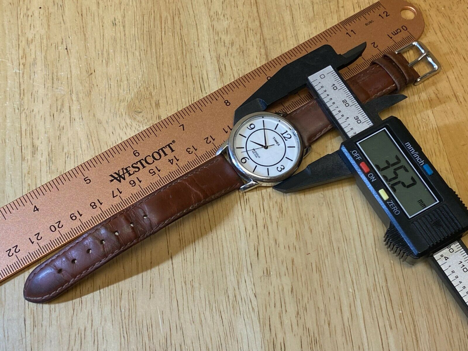 Watch dimension and size: please review the last image for size measurements. Shown on caliper is the approximate watch width in mm without crown or button.