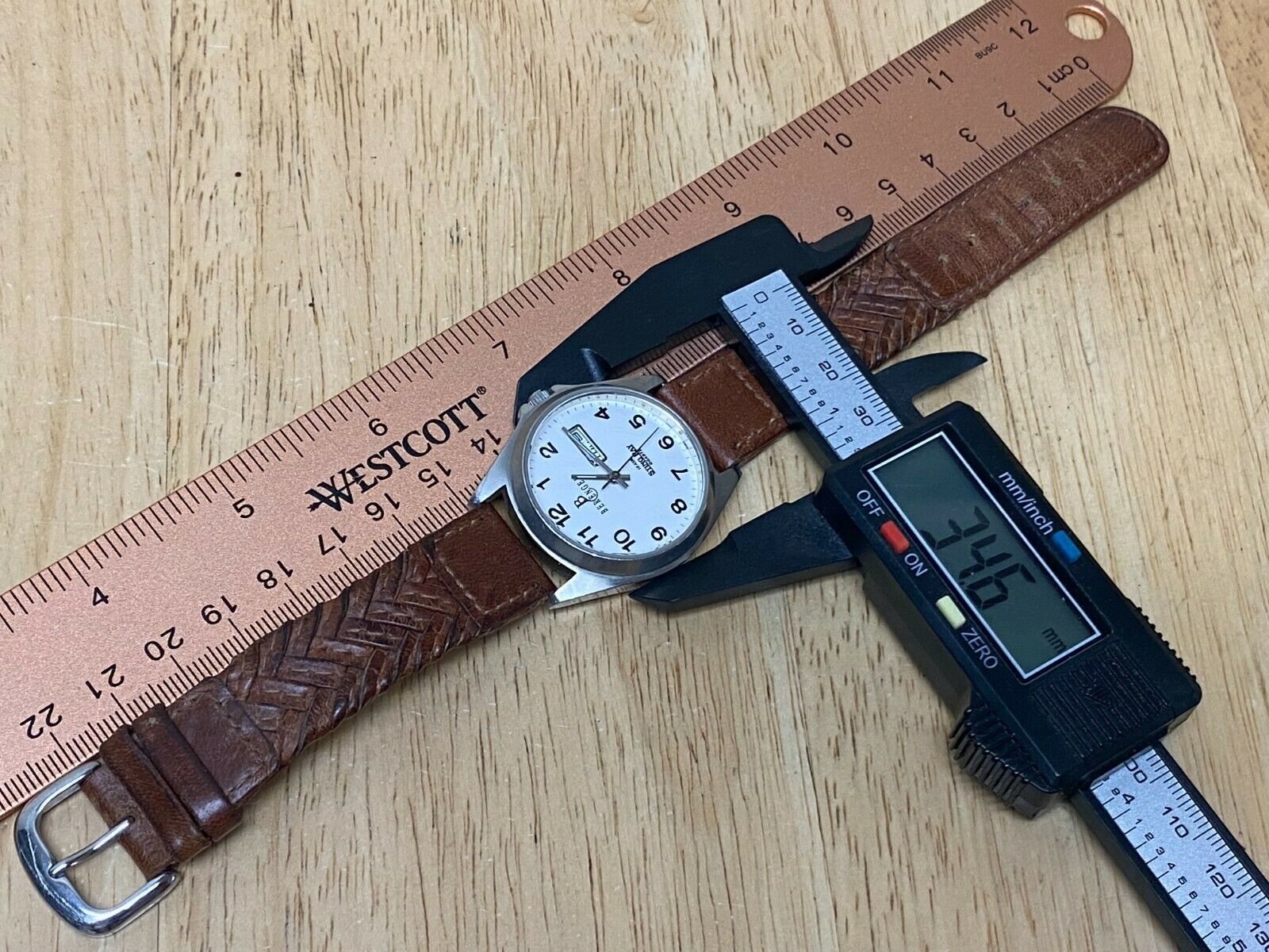 Watch dimension and size: please review the last image for size measurements. Shown on caliper is the approximate watch width in mm without crown or button.