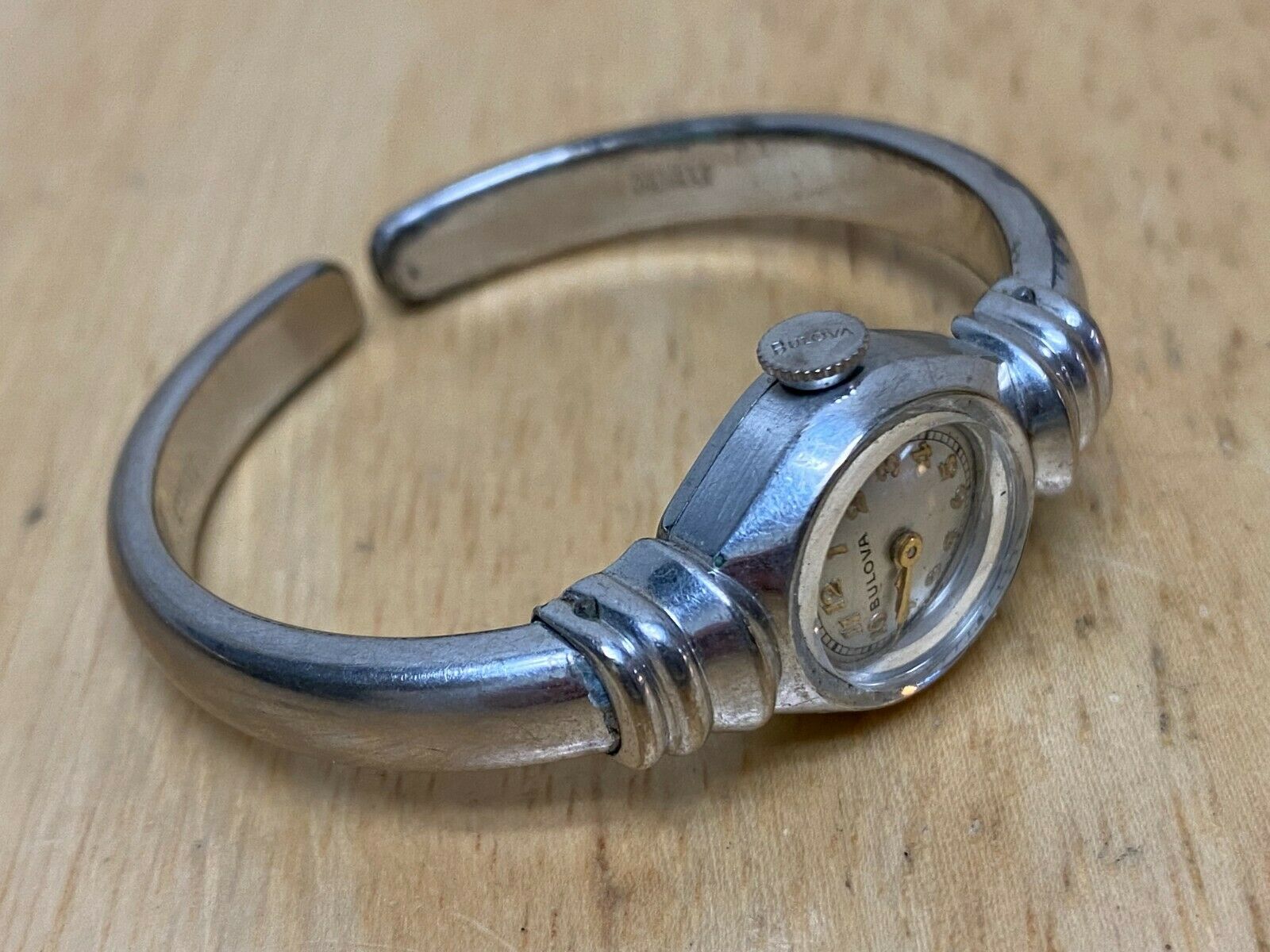 Being tested and monitored for a day or so, this watch runs strong and appears to keep time while being wound. Please review attached images to make your judgment on the cosmetic condition. These images are important part of the listing. You will get what you see (sorry but stand, table and ruler are not included). Please also reading entire text in the description regarding used, old, vintage watches in general. As an used vintage item in general, there might be some dirt, scratches, scuffs, discolorations, and/or other forms of wear here and there, but nothing major for the age in my view except for notable deplating and tarnishing on case and band. Cuff appears little bit deformed and felt somehow not as tight as I would like. Again, please carefully review images to make your own evaluation on cosmetic conditions from different angles. Please do not hesitate to ask if you have any questions.
