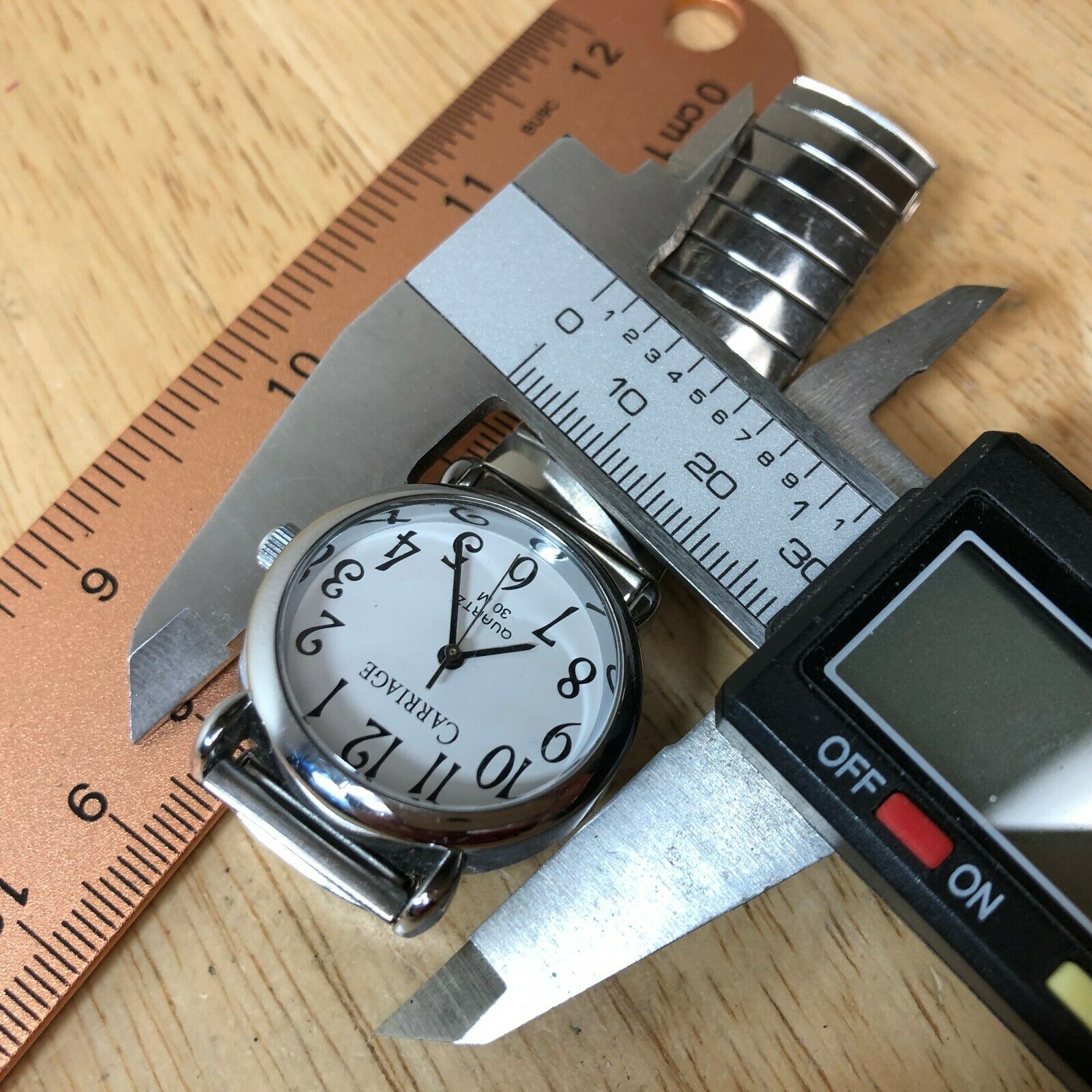 Watch dimension and size: please review the last image for size measurements. Shown on caliper is the approximate watch width in mm without crown or button.