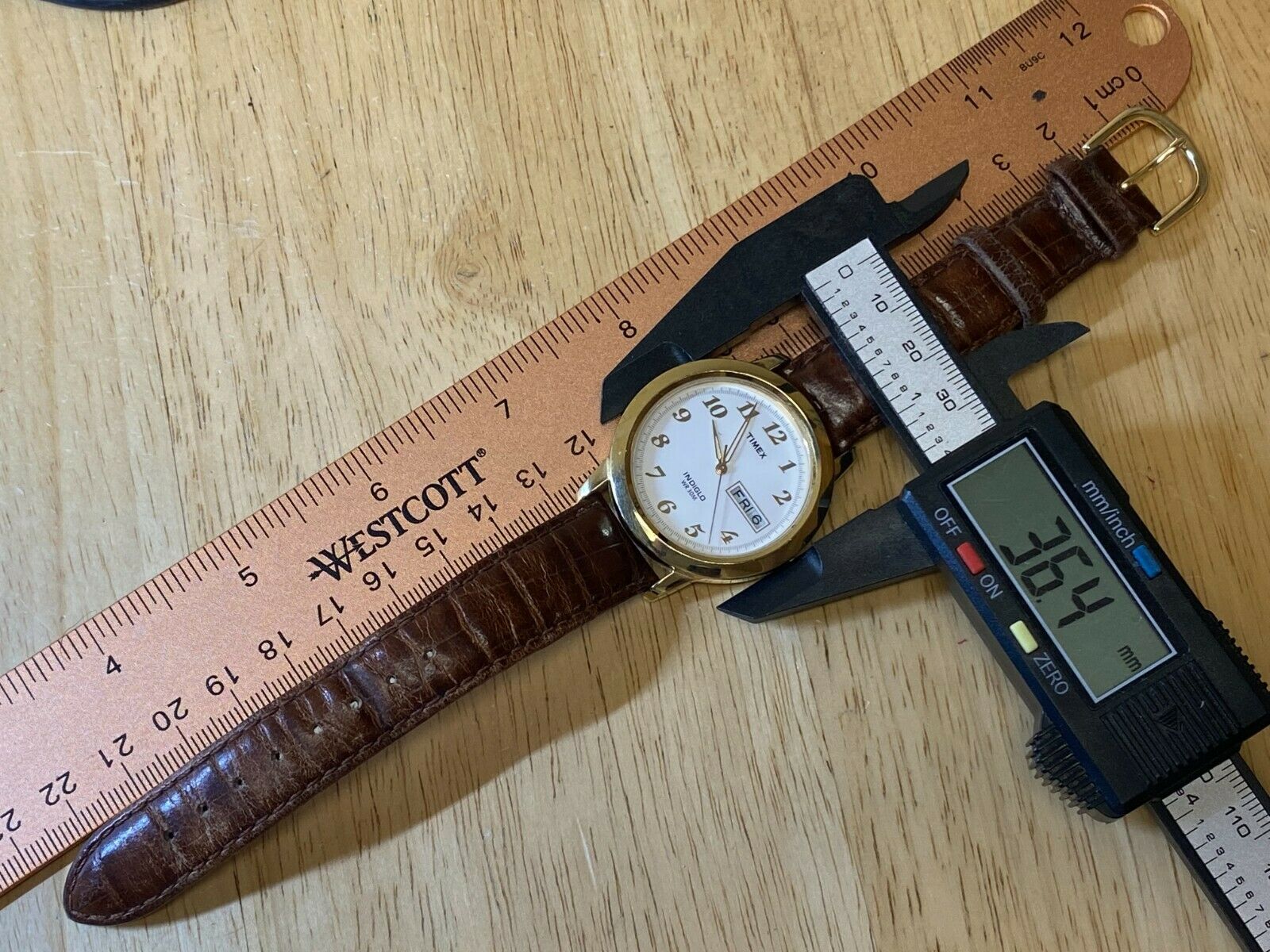 Watch dimension and size: please review the last image for size measurements. Shown on caliper is the approximate watch width in mm without crown or button.