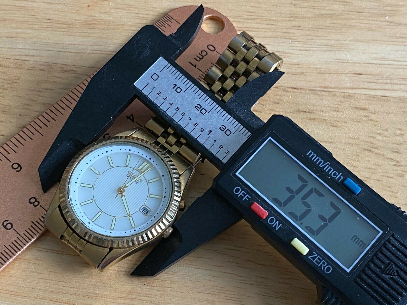 Watch dimension and size: please review the last image for size measurements. Shown on caliper is the approximate watch width in mm without crown or button.