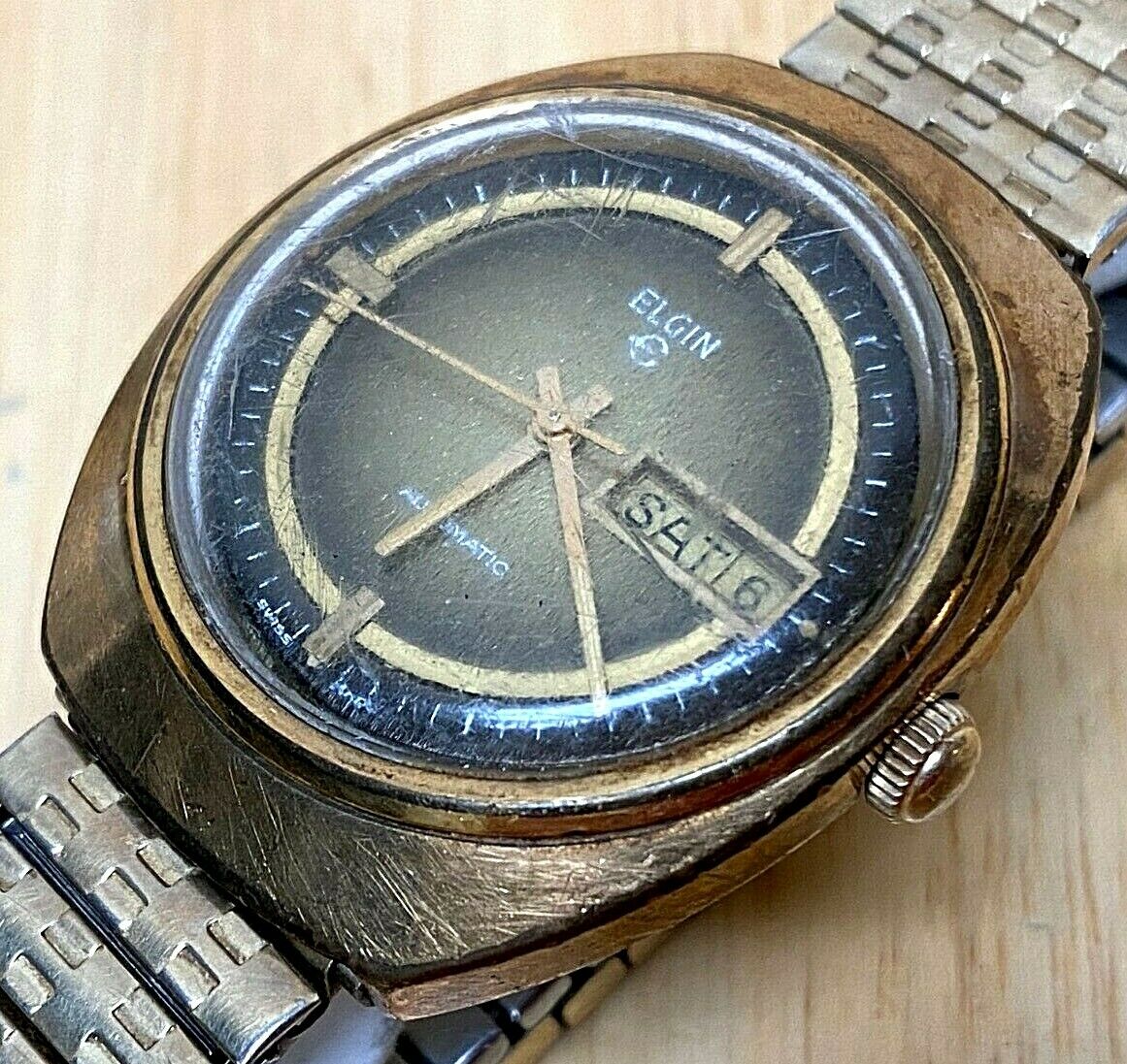This watch ticks away and appears to keep time while being shaken to wound. Long term functionality and accuracy have not been tested. Please be advised that regular maintenance services are always necessary to keep any mechanical watches running properly. Last service date on this watch is unknown. Such services are buyer's responsibility when becoming necessary. Please review attached images to make your judgment on the cosmetic condition. These images are important part of the listing. You will get what you see (sorry but stand, table and ruler are not included). Please also reading entire text in the description regarding used, old, vintage watches in general. As an used vintage item in general, there might be some dirt, scratches, scuffs, discolorations, and/or other forms of wear here and there, but nothing major for the age in my view except for heavy scratches and cracks on crystal, significant wear on case and band. Please turn clockwise only when setting time; turning counterclockwise may unscrew the crown from stem. Again, please carefully review images to make your own evaluation on cosmetic conditions from different angles. Please do not hesitate to ask if you have any questions.