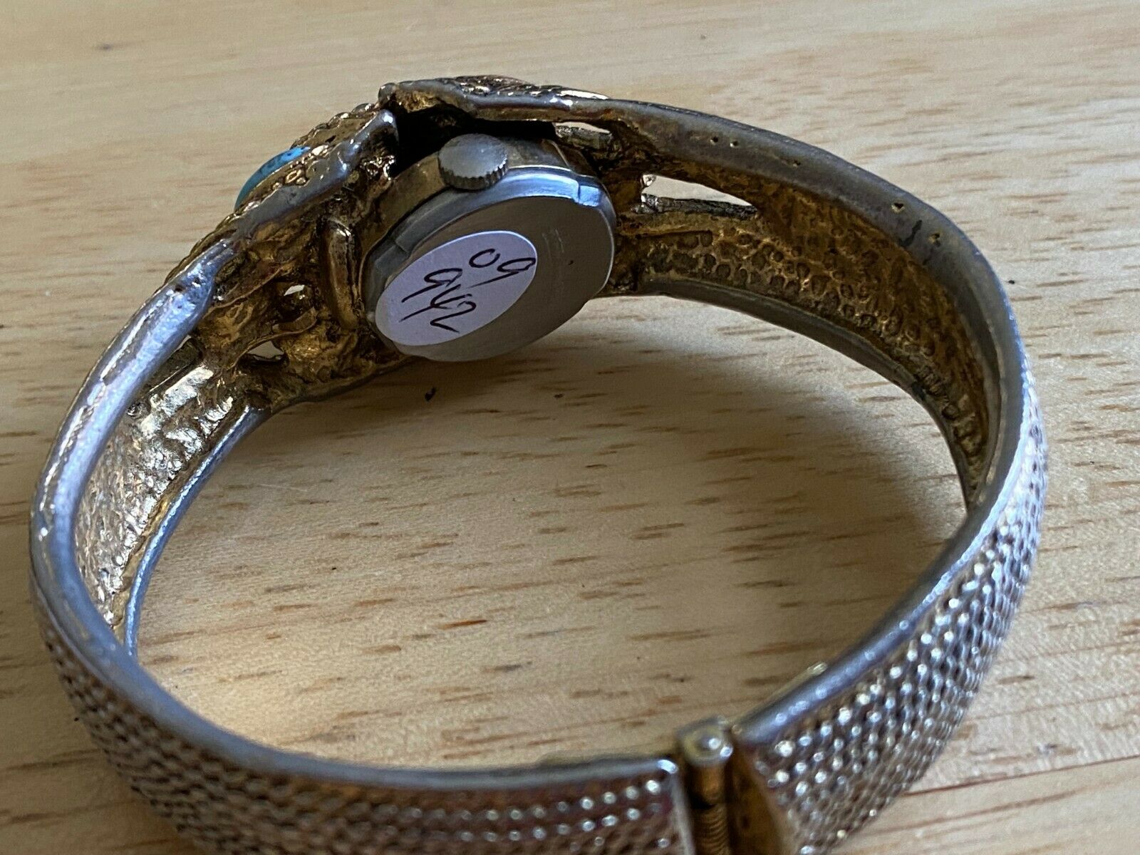 Being tested and monitored for a day or so, this watch runs strong and appears to keep time while being wound. Please review attached images to make your judgment on the cosmetic condition. These images are important part of the listing. You will get what you see (sorry but stand, table and ruler are not included). Please also reading entire text in the description regarding used, old, vintage watches in general. As an used vintage item in general, there might be some dirt, scratches, scuffs, discolorations, and/or other forms of wear here and there, but nothing major for the age in my view except for notable wear on case and band, and missing couple stones from cuff band. Again, please carefully review images to make your own evaluation on cosmetic conditions from different angles. Please do not hesitate to ask if you have any questions.