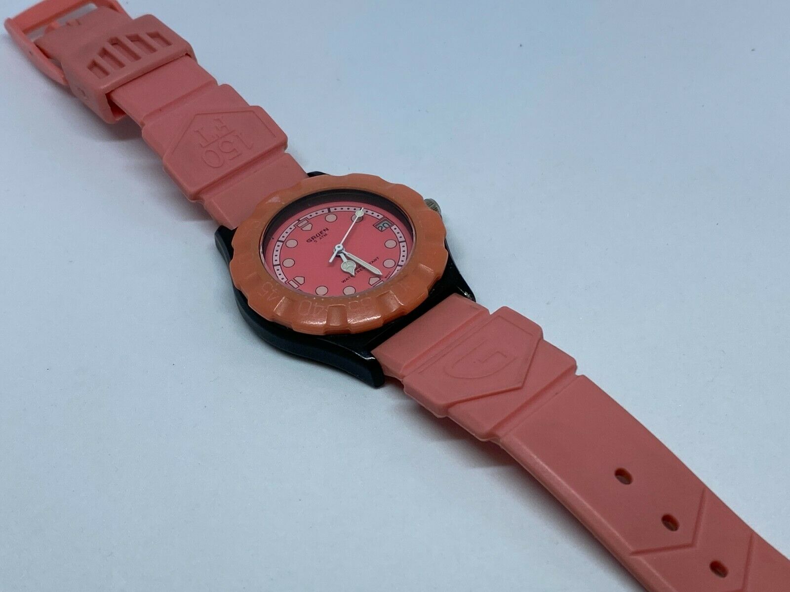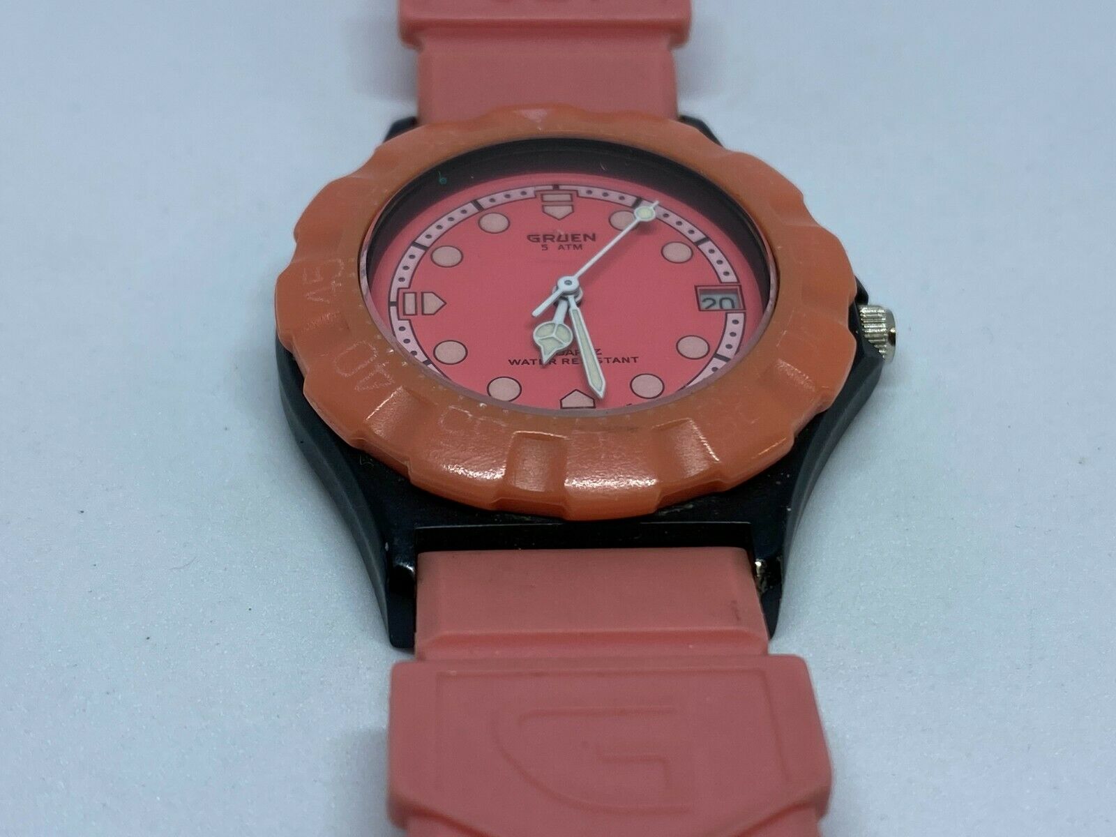 Vintage Gruen 50m Moving Bezel Pink Black Analog Quartz Watch Hour~Date~New Batt