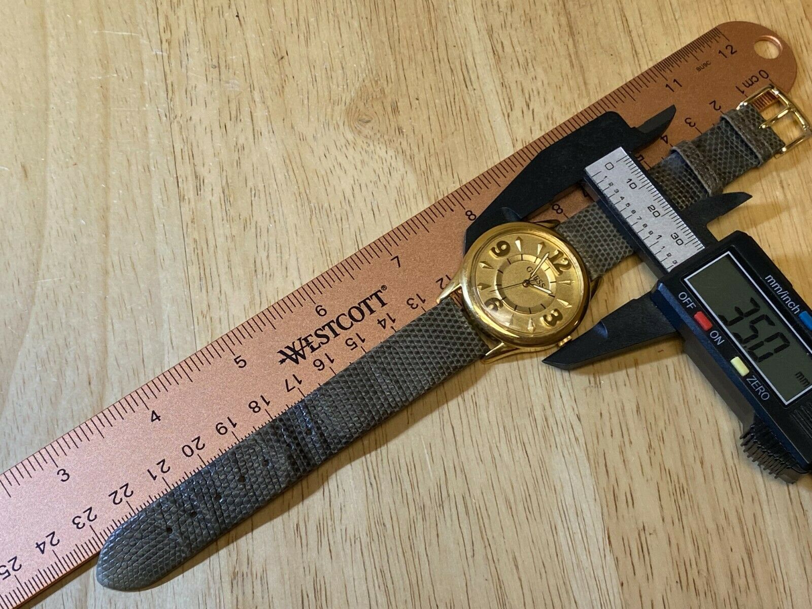 Watch dimension and size: please review the last image for size measurements. Shown on caliper is the approximate watch width in mm without crown or button.