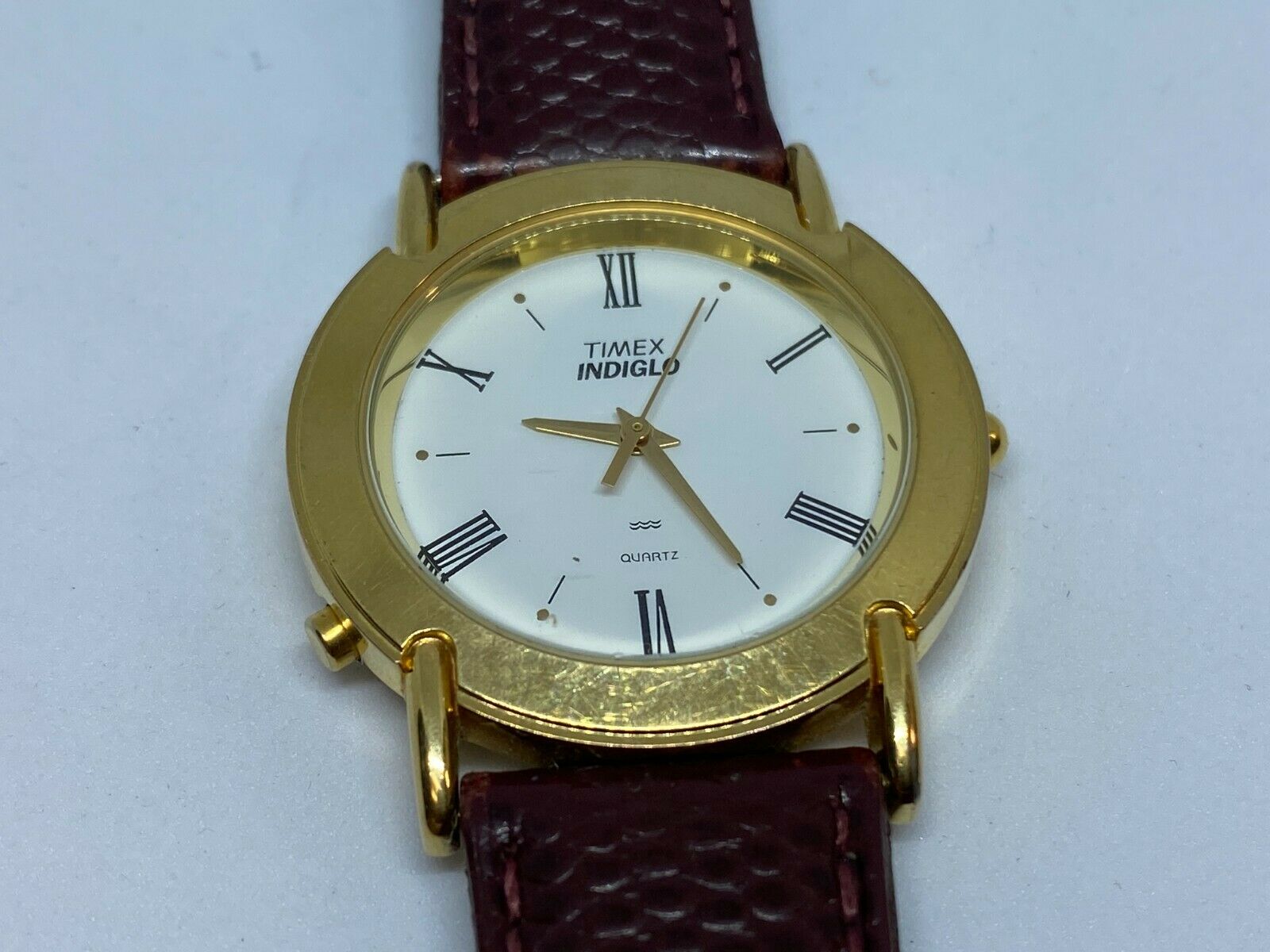 Vintage Timex Indiglo Men Gold Tone Leather Analog Quartz Watch Hour~New Battery